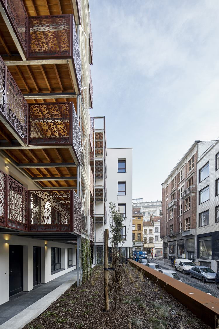 Het volume dat met het “Athénée Funck André” aansluit is vrijwillig lager zodat het geklasseerd gebouw in de straat zijn status behoudt.